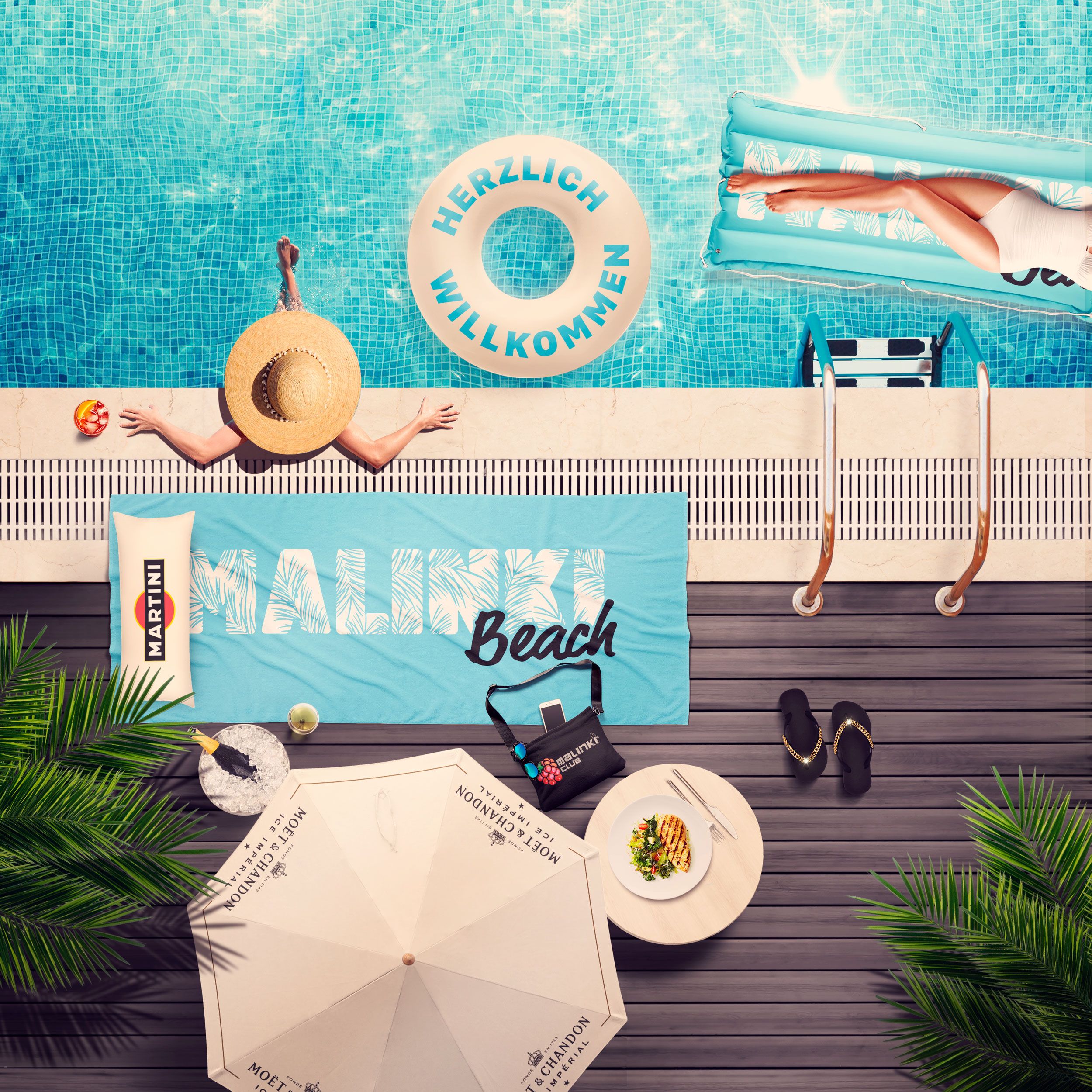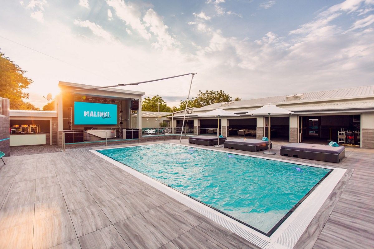 Auf der mittleren Ebene liegt das Herzstück des Malinki Beach, der beheizbare Swimming Pool umrahmt von großzügigen Liegeflächen. Hier kann man bei coolen Drinks von der Bar entspannt in der Sonne und im Pool baden.
